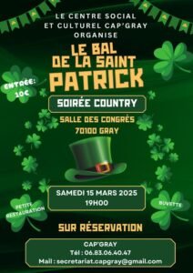 Le Samedi 15 Mars 2025, Bal Country de la St Patrick, chez *Cap Gray*, à 19h00, Salle des Congrès de Gray (70100), Haute Saone.