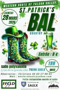 Le Samedi 28 Mars 2026, Bal Country de St Patrick, à 19h00, Chez *Western Boots Of Falcon Valley*, Salle Polyvalente, 5 rue de la Grande Cote, à Saulx (70240), Hau