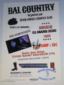 Le Dimanche 1er Mars 2026, Après Midi Bal Country des *Seven Horses Country Club*, avec un Concert du *Duo Countryboys*, à 14h00, Salle des Fetes de St Sauveur (70300), Haute Saône