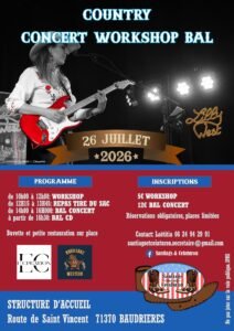 Le Dimanche 26 Juillet 2026, Journée Country Music et Dance animée par *Lilly West*à Partir de 10h00, , avec Workshop, Pause Repas, Bal Concert , Bal cd , Structure D’ac