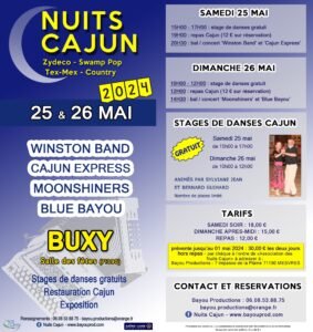 Les 25 et 26 Mai 2024, Week End Nuits Cajun , avec Stages de Danse, Concerts , Salle des Fetes de Buxy (71070), Saone et Loire.