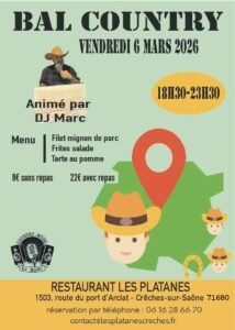 Le Vendredi 06 Mars 2026, Bal Country animé par *DJ Marc*, de 18h30 à 23h30, au Restaurant Les Platanes, 1503 Route du Port D’Arciat, à Creches sur Saône (71680), Saône et Loire.