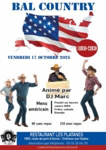 Le Vendredi 17 Octobre 2025, Bal Country animé par *DJ Marc*, de 18h30 à 23h30, Restaurant *Les Platanes*, 1503 Route du Port D’Arciat, à Creches sur Sao