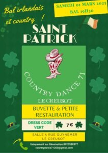 Le Samedi 1er Mars 2025, Bal Irlandais et Country des *Country Dance 71*, à 19h30, Salle , 05, rue Guynemer, à Le Creusot (71), Saone et Loire.