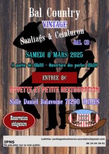 Le Samedi 08 Mars 2025, Bal Country Vintage des *Santiags & Ceinturon*, à 19h00, Salle Daniel Balavoine, à Ormes (71290), Saone et Loire.