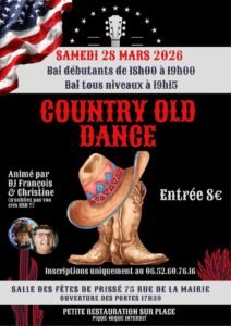 Le Samedi 28 Mars 2026, Bals Country animés par *DJ François et Christine*, un Débutants de 18h00 à 19h00 et un tous niveaux à 19h15, Salle des Fetes , 75 rue de la Mairie
