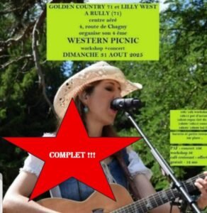 Le Dimanche 31 Aout 2025, Journée Country des *Golden Country 71*, à partir de 10h00, avec Workshop et Concert de *Lilly West*, au Centre aéré, 4 Route de Chagny, à Rully (71), Saon