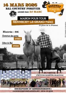 Le Samedi 14 Mars 2026, Bal Country Forever animé par *DJ Marc*, à 17h30, Maison pour tous, Place de la Palette, à Sennecey le Grand (71240), Saône et Loire.