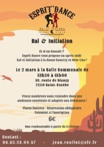 Le Dimanche 02 Mars 2025, Après Midi Bal Country et Initiation, de 13h30 à 18h00, chez *Esprit Dance*, Salle Communale, 89, Route de Blanzy, à St Eu