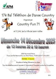 Le Dimanche 14 Décembre 2025, Après Midi Bal Country des *Country Fun 71*, pour le Téléthon, de 13h30 à 19h00, Salle Raymond Devos, rue Camille Desmoulins, a
