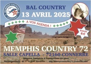 Le Dimanche 13 Avril 2025, Bal Country chez *Memphis Country 72*, Salle Capella, à Connerre (72160), Sarthe.