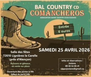Le Samedi 25 Avril 2026, Bal Country cd des *Comancheros*, à 20h00, Salle des Fêtes de Lignières la Carelle (72610), Sarthe.