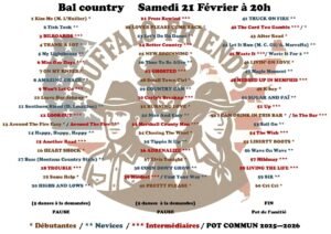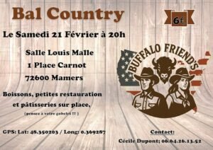 Le Samedi 21 Février 2026, Bal Country chez *Buffalo Friend’s*, à 20h00, Salle Louis Malle, 1 Place Carnot, à Mamers (72600), Sarthe.