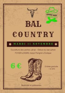 Le Mardi 11 Novembre 2025, Après Midi Bal Country des *Country Anim*, à 14h00, Foyer Loisirs de Parigné L’éveque (72250), Sarthe.