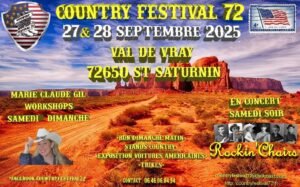 Les Samedi 27 et Dimanche 28 Septembre 2024, Country Festival 72, avec Workshops de *Marie Claude Gil* et Concert des *Rockin’ Chairs*, Val de Vray, à St Saturnin (72650), Sarthe.