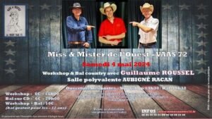 Le Samedi 04 Mai 2024, Workshop et Bal Country avec *Gillaume Roussel*, à 20h00, Salle Polyvalente Aubigné Racan, à Vaas (72), Sarthe.