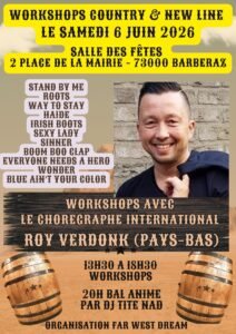 Le Samedi 06 Juin 2026, Journée Country et New Line, avec Workshop de *Roy Verdonk* à 13h30 et Bal animé par *DJ Tite Nad*, à 20h00, chez *Far West Dream*, Salle des Fetes , 2 Place de la Mairie, à Barberaz (73), Savoie.