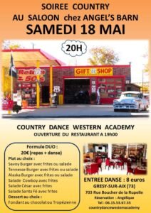 Le Samedi 18 Mai 2024, Soirée Country Dance au Saloon chez *Angel’s Barn*, à 20h00, 703, rue Boucher de la Rupelle, à Gresy sur Aix (73), Savoie.