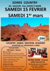 Le Samedi 15 Février 2025, Soirée Country à 20h00, au Saloon, chez *Angel’s Barn*, 703, rue Boucher de la Rupelle, à Gresy sur Aix (73), Savoie.
