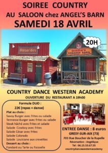 Le Samedi 18 Avril 2026, Soirée Country des *Country Dance Western Academy*, chez *Angel’s Barn*, à 20h00, 703 rue Boucher de la Rupelle