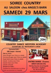 Le Samedi 29 Mars 2025, Soirée Country chez *Angel’s Barn, à 20h00, 703, rue Boucher de la Rupelle, à Gresy sur Aix (73), Savoie.