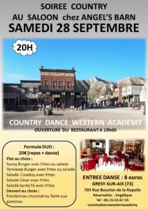 Le Samedi 28 Septembre 2024, Soirée Country à 20h00, au Saloon, chez *Angel’s Barn*, 703, rue Boucher de la Rupelle, à Gresy sur Aix (73), Savoie.