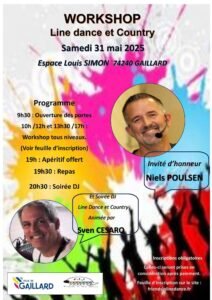 Le Samedi 31 Mai 2025, Journée Line Dance et Country à partir de 10h00, avec Workshop de *Niels Poulsen* et Soirée CD animée par *Sven Cesaro*, Espace Louis Simon, à