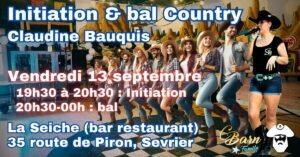 Le Vendredi 13 Septembre 2024, Initiation et Bal Country à partir de 19h30, au Bar Restaurant *La Seiche*, 35 Route de Piron, à Sevrier (74), Haute Savoie.