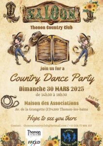 Le Dimanche 30 Mars 2025, Après Midi Country Dance Party, chez *Thonon Country Club*, de 14h30 à 18h30, Maison des Associations, Avenue de la Grangette, à T
