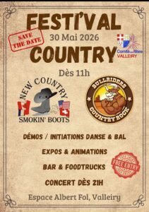 Le Samedi 30 Mai 2026, Festi’Val Country des *New Country Smokin’Boots*, dès 11h00, avec Démos, Initiations Danse et Bal, Expos et Animations, Concert des *Bullriders Country