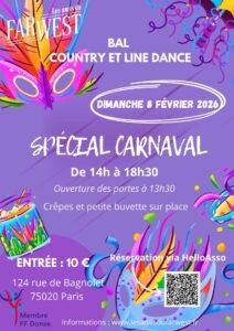 Le Dimanche 08 Février 2026, Après MidiBal Country et Line Dance Spéciale Carnaval, de 14h00 à 18h30, 124 rue de Bagnolet, à Paris (75020), Paris.