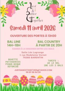 Le Samedi 11 Avril 2026, Journée Line et Country chez *Just Dance Together*, à partir de 14h00 avec Bal Line et Bal Country à 20h00, Salle Léo Lagrange, 1 rue Madeleine Vernet, à Barentin (76360), Seine Maritime.