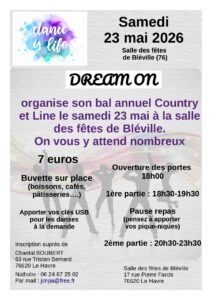 Le Samedi 23 Mai 2026, Bal Country et Line annuel des *Dream on*, de 18h30 à 23h30, Salle des Fêtes de Bléville (76), Seine Maritime.