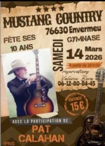 Le Samedi 14 Mars 2026, Bal Country chez *Mustang Country*, qui Fetera ses 10 ans, avec un Bal et Concert de *Pat Calahan*, à partir de 16h00, au Gymnase D’envermeu (76630),