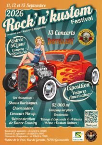 Du Vendredi 11 à 17h00 au Dimanche 13 Septembre 2026 à 10h00, Festival Rock’n’Kustom proposé par *L’association CTB Rogerville*, avec 13 Concerts, ExpositionVoitures Americaines, Shows Burlesques, Concours Pin Up, Démos de Danse Country, Plaine de la Paix, rue de Gerville, à Gainneville (76700), Seine Maritime.