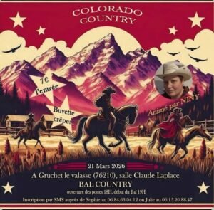 Le Samedi 21 Mars 2026, Bal Country animé par *Niny*, chez *Colorado Country*, à 19h00, Salle Claude Laplace, à Gruchet le Valasse (76210), Seine Maritime.