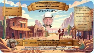 Le Samedi 03 Octobre 2026, Soirée Country des *Colorado Country*, avec Workshop de *Stefano Civa* et Bal Country, à partir de 18h00, Salle Claude Laplace, à g