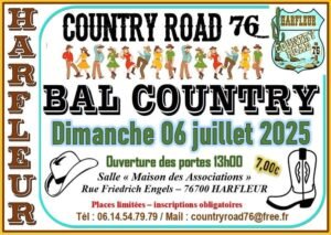 Le Dimanche 06 Juillet 2025, Après Midi Bal Country à partir de 13h00, chez *Country Road 76*, Salle Maison des Associations, rue Friedrich Engels, à Harfleur (76700), Seine Maritime.