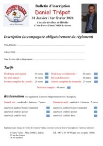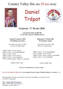 Du 31 Janvier au 1er Février 2026, Week End Country Line Dance animé par *Mike Liadouze * chez *Country Valley*, qui Fetera ses 20 ans avec *Daniel Trepat*, Workshops et Bals, Line le Samedi et Country le Dimanche, à la Salle des Fetes