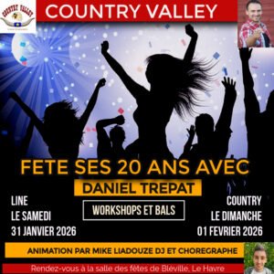 Du 31 Janvier au 1er Février 2026, Week End Country Line Dance animé par *Mike Liadouze * chez *Country Valley*, qui Fetera ses 20 ans avec *Daniel Trepat*, Workshops et Bals, Line le Samedi et Country le Dimanche, à la Salle des Fetes