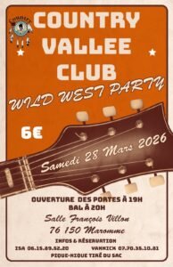 Le Samedi 28 Mars 2026, Soirée Wild West Party à 20h00, chez *Country Vallee Club*, Salle Francois Villon , à Maromme (76150), Seine Maritime.