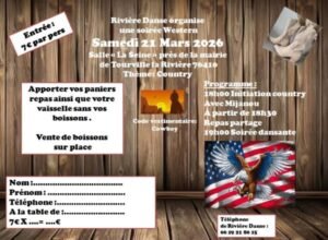 Le Samedi 21 Mars 2026, Soirée Country chez *Rivière Danse*, à partir de 18h00, Salle La Seine, près de la Mairie de Tourville la