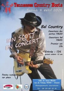 Le Samedi 04 Avril 2026, Bal Country des *Tennessee Country Boots*, à 19h45 avec 1er Set du Concert de *Yan Scott* à 21h00, Salle du Vieux Moulin, rue de L’étan