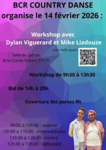 Le Samedi 14 Février 2026, Journée Line Dance des *BCR Country Danse*, de 09h30 à 20h00, avec Workshop et Bal, Salle du Safran, à Brie Comte Robert (77170), Seine et Marne.