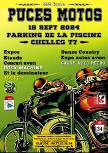 Le Dimanche 15 Septembre 2024, 22 ème Journée Puces Motos, avec Danse Country, Parking de la Piscine, à Chelles (77), Seine et Marne.