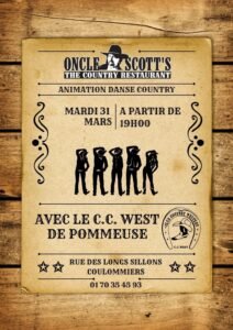 Le Mardi 31 Mars 2026, Soirée Country Dance, à partir de 19h00, avec le *C.C.West de Pommeuse*, chez *Oncle Scott’s The Country Restaurant*, rue des Longs Sillons, à Coulommiers (77), Seine et M