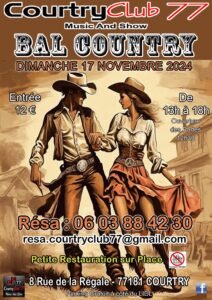 Le Dimanche 17 Novembre 2024, Après Midi Bal Country de *Courtry Club 77*, de 13h00 à 18h00, 08, rue de la Régale, à Courtry (77181), Seine et Marne.