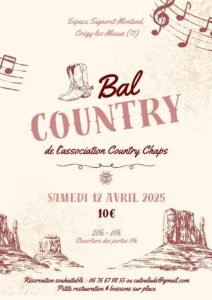 Le Samedi 12 Avril 2025, Bal Country des *Country Chaps*, de 20h00 à 01h00, Espace Signoret Montand, à Cregy les Meaux (77), Seine et Marne.