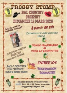 Le Dimanche 15 Mars 2026, Après Midi Bal Country des *Froggy Stomp*, animé par *Patrice Chollet * , à 14h00, Salle des Fetes , rue de la Planche Cou