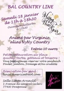 Le Samedi 18 Janvier 2025, Après Midi Bal Country Line, *Happy New Year*, animée par *Virginie Alias Nyny Country *, de 13h00 à 18h30, Salle Simon Arnauld, 01, Avenue du Général Leclerc, à Pomponne (77400), Seine e
